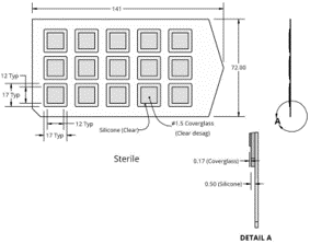 產(chǎn)品由上下兩部分構(gòu)成:上層是No.1.5厚度的玻璃蓋玻片,下層是0.5mm厚度的透明硅膠片,無菌包裝可直接使用。設(shè)計上硅膠片較玻璃片略大,比如蓋玻片12*12mm大小,下方的硅膠片17*17mm大小,產(chǎn)品大小特別適于培養(yǎng)皿和培養(yǎng)板使用。包裝時,背襯底板是透明大塑料板,一板15個,一包有5板(共計75個)。